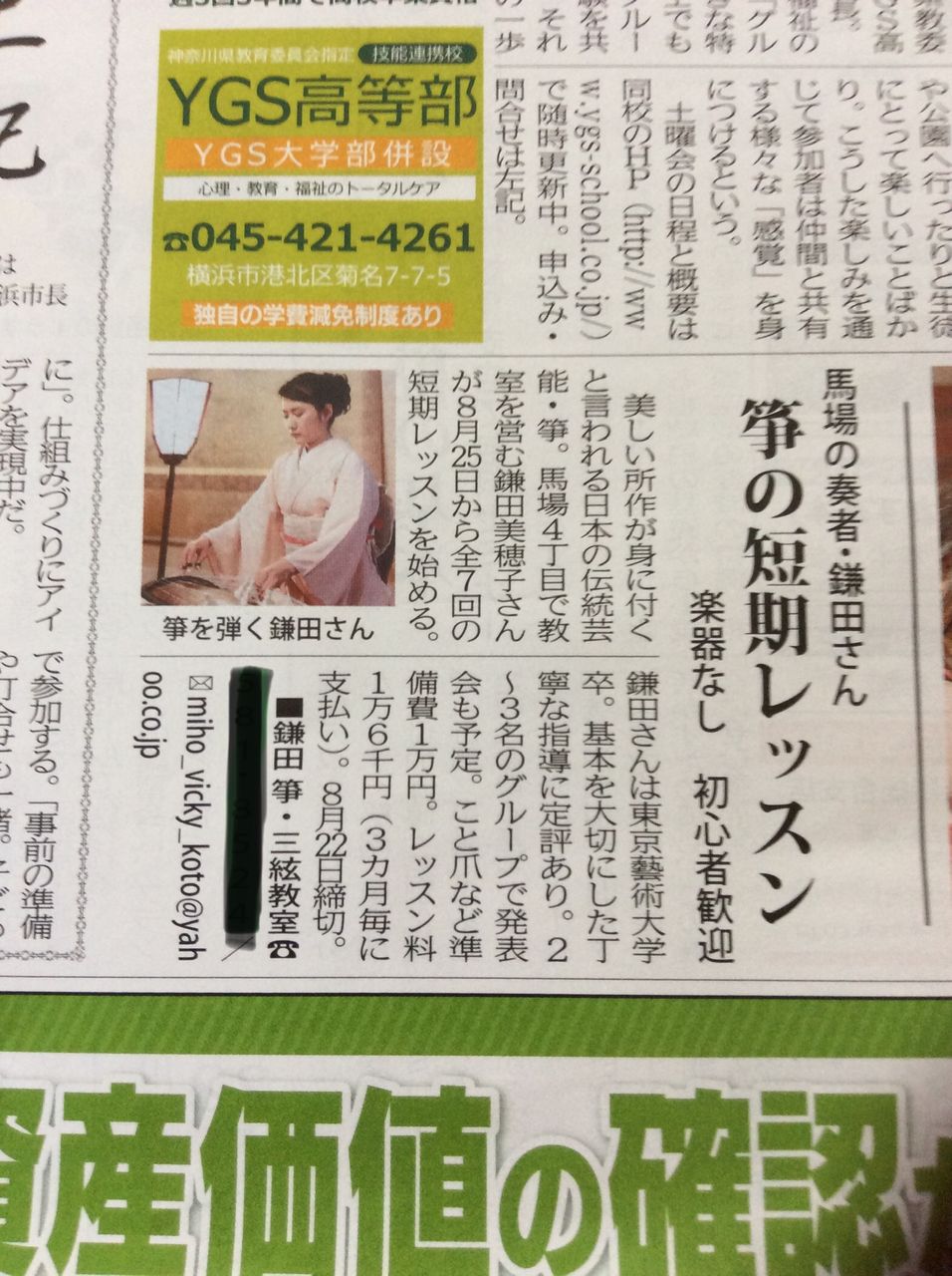 タウンニュース鶴見区版に 箏奏者 鎌田美穂子の箏 庭