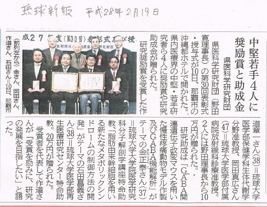 琉球大学大学院医学研究科 分子解剖学講座 2016年2月19日 沖縄県医科学財団研究助成採択